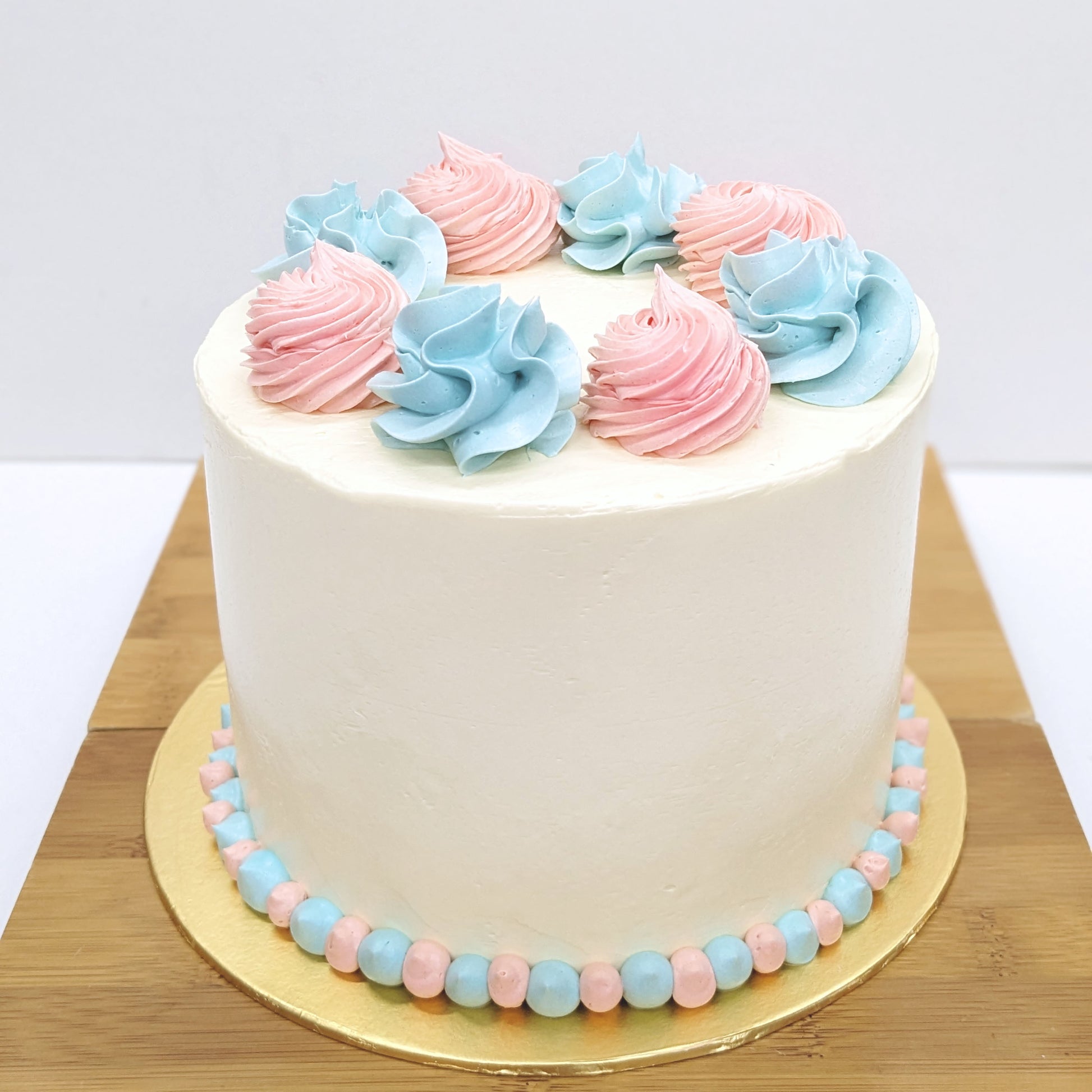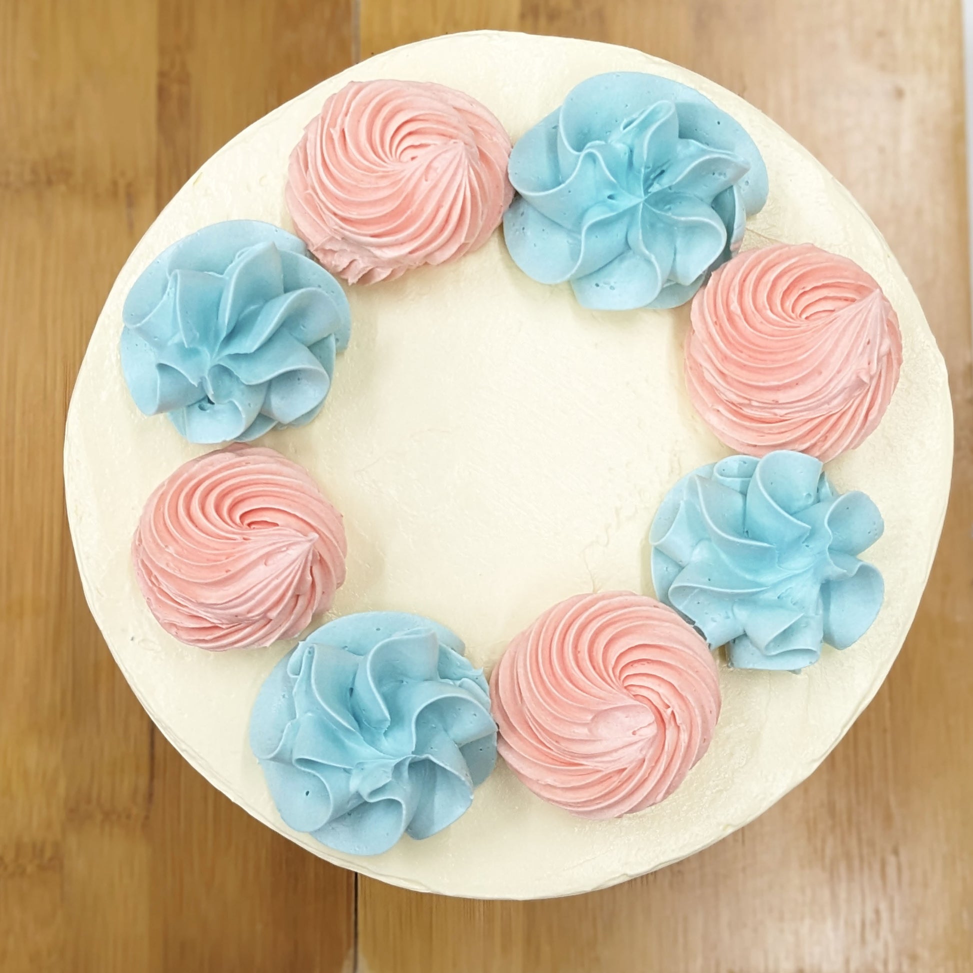Available in Chocolate or Vanilla Cake + Gender Reveal frosting in between the cake layers, select your preference for cake type and reveal colour below.